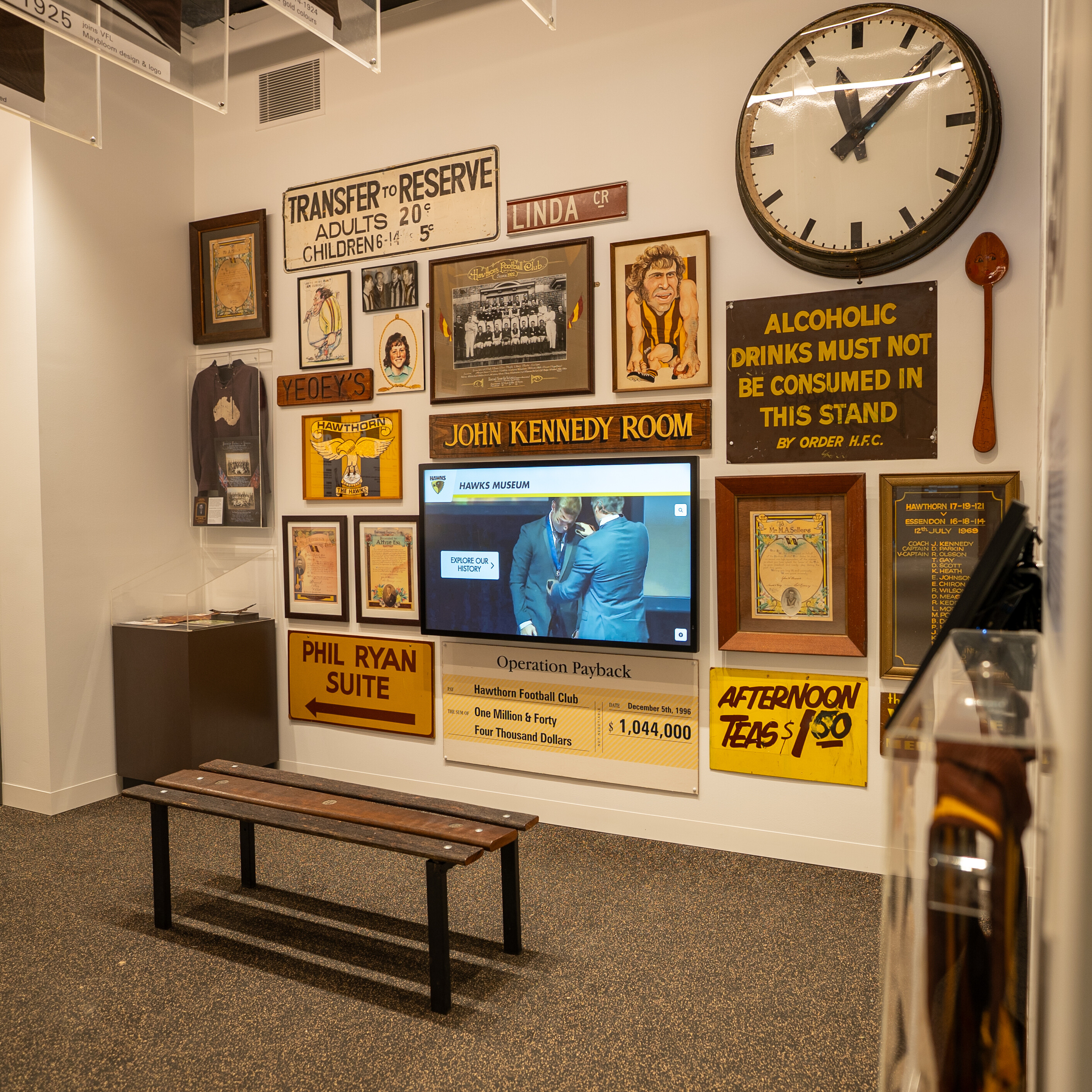 Accredited by Museums Australia in 2013, the Hawks Museum proudly stands as the AFL's only accredited museum open to the public. Embark on a self-guided tour and delve into the rich history of our club, guided by our Museum expert staff or our Information Tablet that provides detailed explanations of the diverse exhibits and displays.